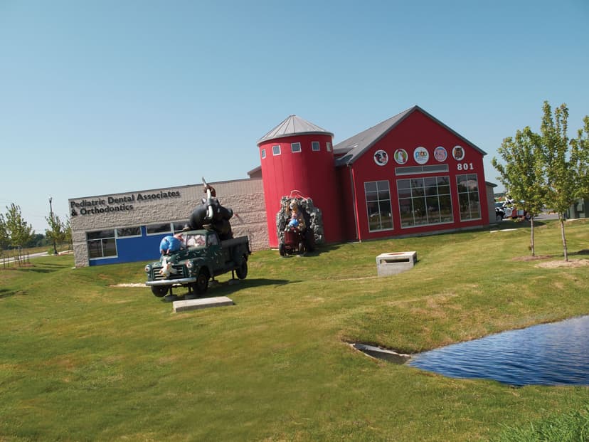 PEDIATRIC DENTAL ASSOCIATES & ORTHODONTICS - BENTONVILLE, ARKANSAS | TONYA TRIPLETT, DDS It's not hard to find the new office of Pediatric Dental Associates & Orthodontics in Bentonville, Arkansas. Just look for the tractor driven by farm animals bursting through a huge red “barn” wall or the pickup truck filled with a collection of cows, horses, and other critters that’s parked outside! This spectacular, barnyard-themed pediatric office is the second location for Dr. Tonya Triplett and her partners, Dr. Jerry Sanders, Dr. Will Tompkins, Dr. Courtney Smith, and Dr. Jason Landers. It’s a colorful and playful office like nothing you’ve ever seen, and it’s all about making children happy and comfortable so that their