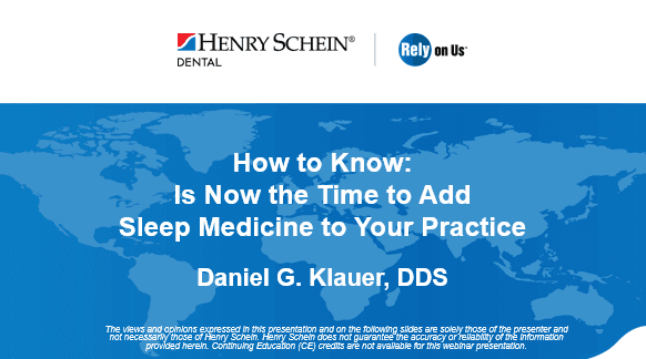 This is a summary of the webinar, hosted by Henry Schein with featured speaker, Daniel Klauer, DDS. You may watch the webinar here. -------------------------------------------------------------------------------- Twenty-six percent of adults suffer from obstructive sleep apnea, and 80% are undiagnosed. Roughly one in four patients' dentists see today may have this potentially serious sleep disorder and many are unaware of it. Practitioners like Dr. Daniel Klauer are working to change that. Dr. Klauer runs and operates the TMJ and Sleep Therapy Center of Northern Indiana and the Myofunctional Therapy Center in South Bend, Indiana. His practice is 100% focused on TMJ (temporomandibular joint) and sleep therapy, assisting roughly 75 patients a month who are suffering