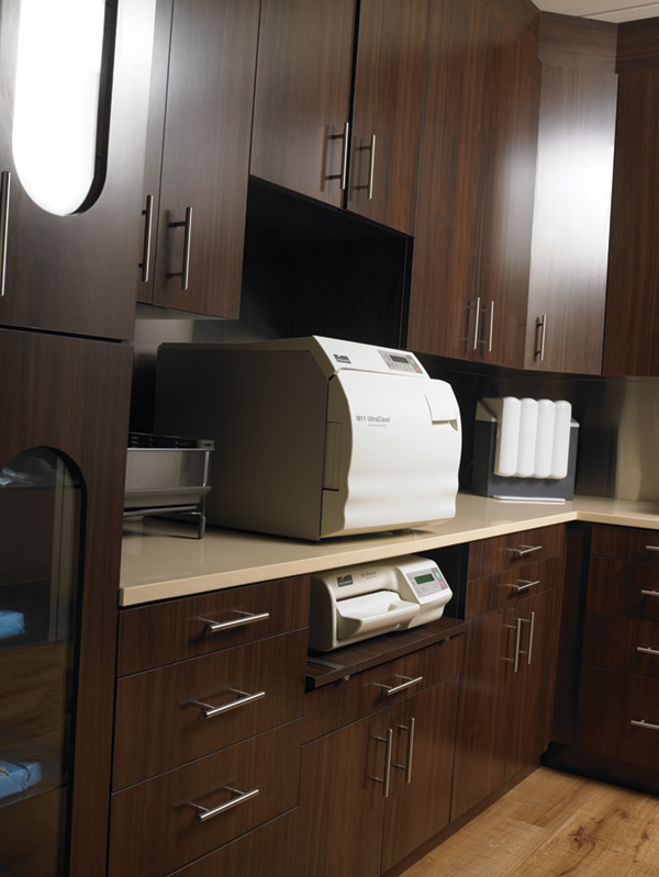 Quartz countertops and a stainless steel back splash give the sterilization center a clean look.