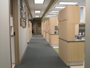 The office’s 4,000-sq. ft. space houses 6 regular and 2 surgical operatories are equipped with the high-end technology needed to drive Dr. Schulter’s practice. Sleek, ultramodern Midmark patient chairs; Matrx central evacuation system, compressor, and nitrous units; and cable/DVD in each operatory expand patient comforts and relieve stress during procedures, and put the office on-track to efficiently attend to the business of dentistry. Ergonomically designed operatories give optimal freedom of movement to staff members, creating more ideal logistics for better workflow and enhanced productivity. Each operatory’s freestanding modular cabinetry allows maximized storage capacity, functional work surfaces, and easy access to materials. The outer cabinets buttress the hallway and give the impression of a pseudo-wall while increasing the feeling of spaciousness.