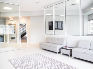 The result is remarkable. The office is striking with ultramodern décor and architectural elements. Crisp, clean lines are interspersed with eye-catching textural accents. The dominant colors in the reception area are a cool tan and white. Smooth leather furniture and bold chevron-patterned carpeting are the ultimate in sophistication. Interest is introduced through abstract art along the wall and a large piece that lends serenity to the waiting area and looks like a placid lake with gentle ripples running across its surface. The check-in desk, too, is characterized by simplicity, but visual interest is added with a textured façade at the front.
