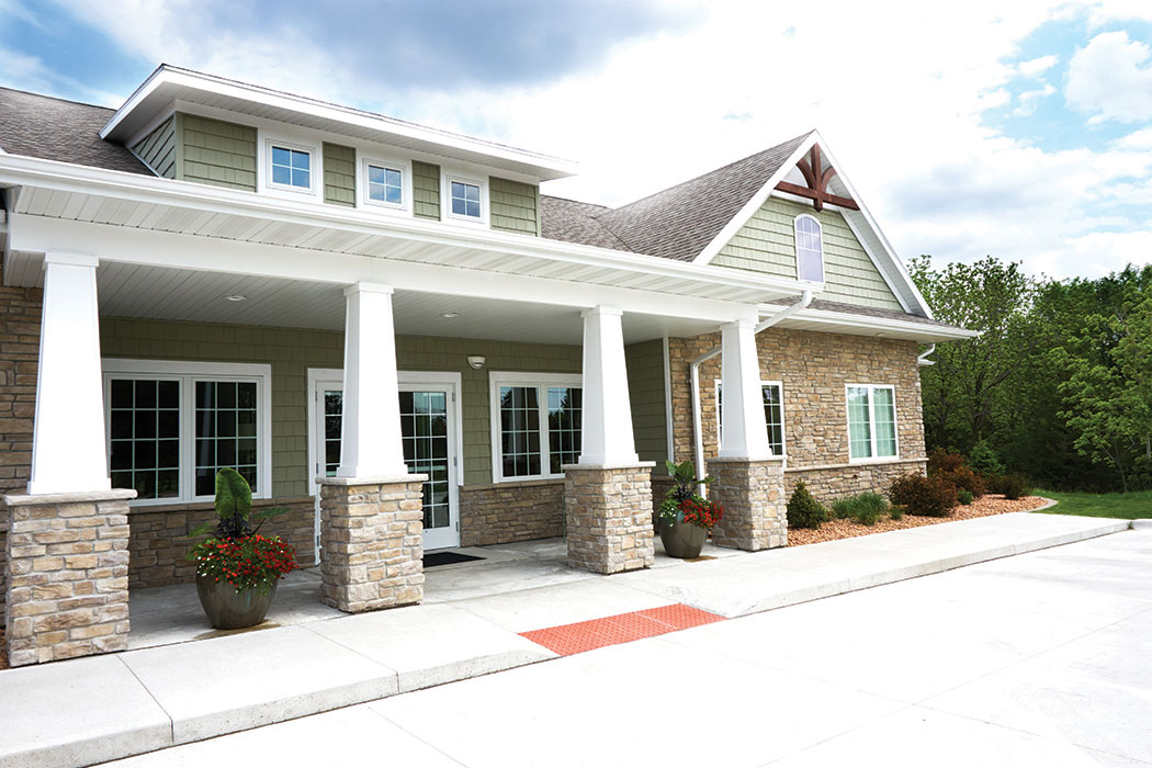 From the exterior, this classic, rich style is evident. With brick and sage-green siding and white pillars out front, it looks welcoming and warm. The brick is carried into the reception area with a feature wall that also hosts a large television monitor. Chairs are simple, with rich upholstery and leather, and the colors are neutral tan and cream. A children’s area with miniature-sized chairs and a table along with a cheerful geometric pattern on the wall provides even the youngest patients with a comfortable place to wait for their appointment.