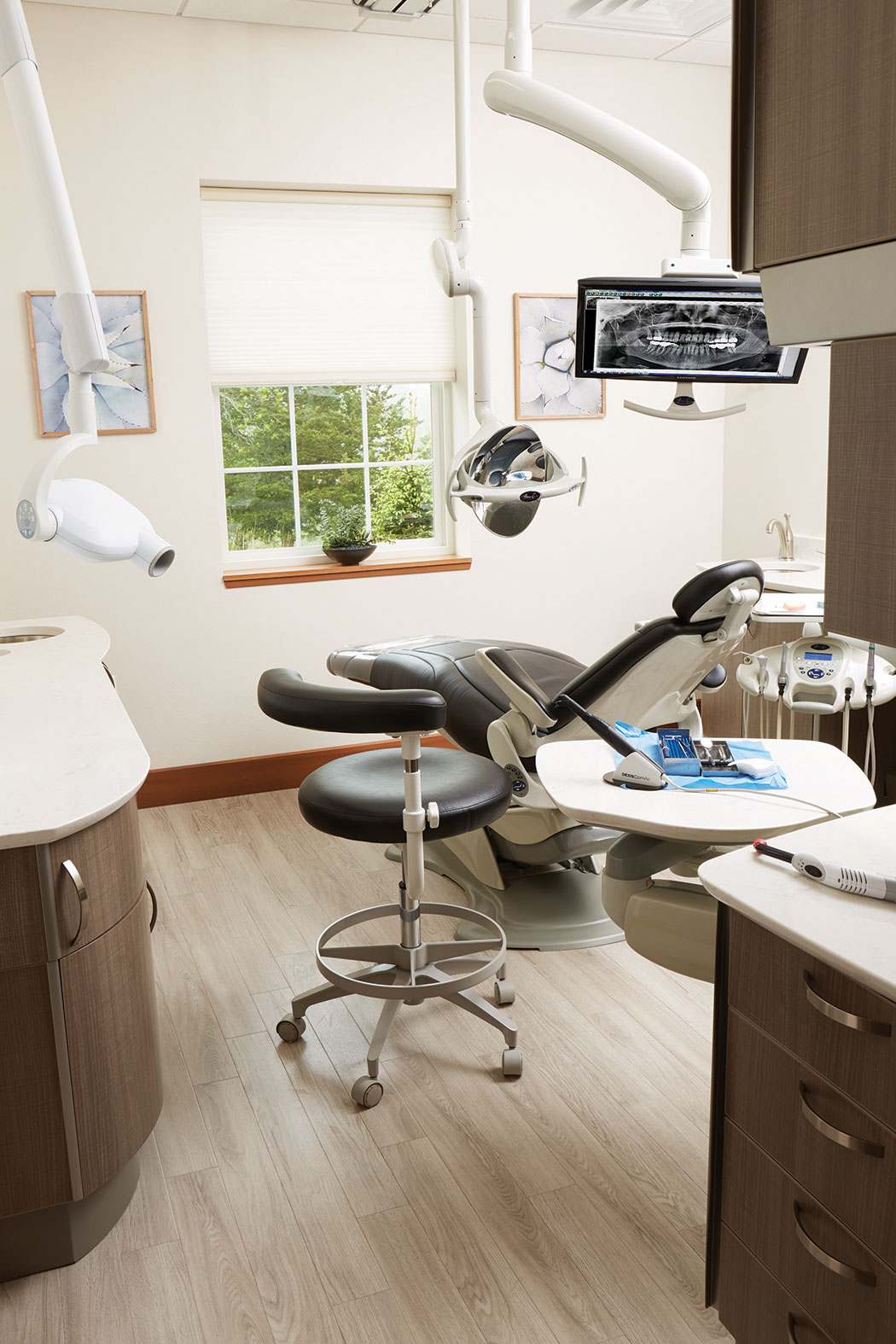 The carpeting gives way to simulated wood tiles in the 10 equipped treatment rooms that line the exterior of the practice. With a separate entrance and exit separated by a 12 o’clock cabinet, the treatment rooms are open, but also private.