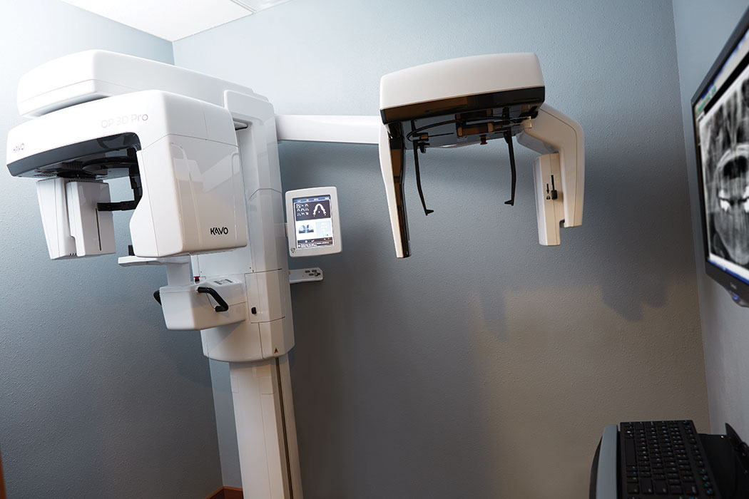 The operatories have KaVo integrated TLC electric motors and ACTEON piezo scalers, and they also use the DEXIS CariVu caries detection device and Digital Doc intraoral cameras. Dr. Clay’s digital-imaging capabilities received a turbocharge with the addition of the KaVo OP 3D cone beam and ceph imaging system. He displays the highly detailed images on a 46” monitor in his consultation room, to his patients’ amazement.