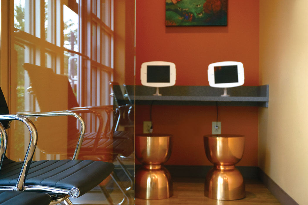 The 2,650 square-foot general dentistry practice is bright and cheerful, designed with a lush rainforest theme. A lively color palette of oranges and greens is fresh and invigorating, with custom lighting that’s unique and adds texture and movement to the reception area. This crisp and contemporary office, with its glass walls, kids’ area complete with iPads, quartz countertops, and faux wood flooring, has a sophistication that is carried into seven treatment rooms—five that are currently equipped, with two reserved for future growth.