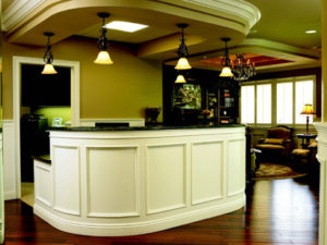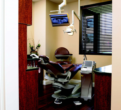 Richly colored area carpets run the length of hallways and anchor the seating area in the reception lounge where custom, silk-upholstered chairs cluster around a beautifully carved dark-wood fireplace. Overhead, a sparkling crystal chandelier suspends from a recessed tray ceiling, creating additional drama. Above the fireplace's mantel, a 52-inch, LCD highdefinition television is concealed behind a VisionArt® system that shows a fine art print or a photographic image when the television is not in use. Patients can also enjoy a variety of reading materials available on the built-in bookshelves surrounding the fireplace. A water fountain sings softly in the background and there are plenty of edible amenities to help patients pass the time when awaiting treatment. Accessories with the charm of a French salon reoccur throughout the office, reflecting its inviting continental theme.