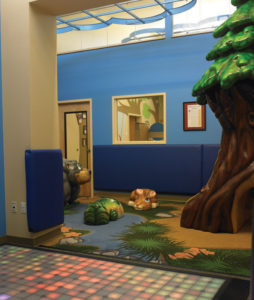 Two distinctive play areas have been created to offer children and teens activities that provide amusement and recreation. The children's room incorporates a delightful play scenario composed of soft sculpture that mimics a nature preserve (complete with bears!), computer games, and an 8-foot, round rotating climbing wall—all guaranteed to make waiting for treatment a breeze. Next door, the signage calls out Teen Room...PG-13, fair warning for a very cool place that has plenty of way-above-average fixtures for the older patient, including Wii games and an iPOD station.