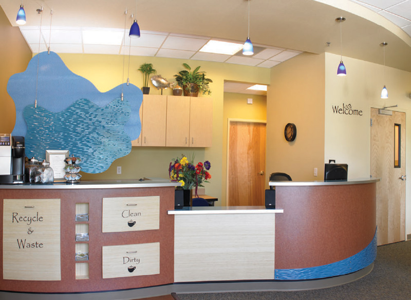Leadership in Energy and Environmental Design's (LEED) program uses a rating system that is the nationally recognized standard for green buildings. To become certified, projects must earn "points" within each of LEED's five categories: sustainable site development, water savings, energy efficiency, materials selection, and indoor environmental quality. "I wanted to invest in an energy-efficient building that would save in the long run and look more desirable to potential buyers in 20 years time," comments Dr. Evans. "Its environmental controls make it more user friendly for the staff and patients. With the Gold level, we had a host of innovations that gave us both energy efficiency and green-conscious decor that our patients' families admired and felt comfortable in. We choose a plenum flooring heating/cooling system, which was the first of its kind in Northern Colorado. Solar power and on-demand water heaters feed the system that flows through the floor. Forced air pushes heat or A/C where needed...this should save huge amounts on our heating/ cooling costs."