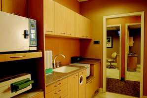 Mellow earth tones prevail in the office’s decor—warm cherry wood on cabinets, soft gold on walls, and multitone Berber carpet in the hallways—creating a relaxed, low-key environment that facilitates a more positive treatment outcome. The 3,000-sq. ft. office expanse houses several operatories and a separate hygiene room. Operatories are "fully loaded" with individual X-ray/ intraoral cameras and flat-screen video monitors with multiple functions of satellite TV, DVD-CD, and XM satellite radio to enhance the patient’s relaxation during treatment.