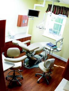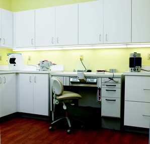 Sullivan-Schein National Design Group Manager, Jennifer Rhode, worked out the floor plan for Laurel Manor. She collaborated with our architect and the results were just fabulous. The interior finishes were chosen based on appearance and durability. We have standardized the look and feel of our offices. We use LG commercial vinyl in the operatories—it looks like real wood—and Mohawk modular carpet in the offices and waiting area. Every horizontal surface in the office is a Wilson Arts or Corian solid surface. We wanted everything to be easy to clean and easy to maintain. The waiting room has the look and feel of an exclusive country club—dark wainscoting on the walls, a tapestry sofa, and leather club chairs. The mood transfers itself directly into the operatories. The cabinetry, patient chairs, and all adjacent equipment reinforce the understanding that the best treatment is available here.