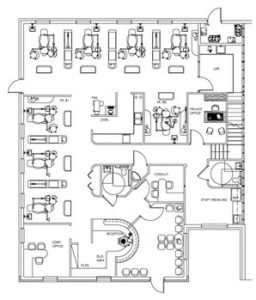 The equipment was easy to select because after you have built a few offices, you know what you want. We chose the Pelton & Crane cabinets and their Spirit 3000 chairs with built-in massage; a Solaris sterilization center with HydrIM instrument washer; and the Delta 10 autoclave. The office uses track-mounted LCD screens. The DENTRIX system is used in all offices and includes Intel duo PCs with dual monitors in each of the operatories. This is a great system. It allows the patient’s chart to be displayed on one monitor while the patient views something different on the other.