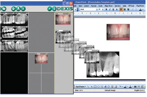 Besides keeping the office coordinated, case presentation with integrated software shows potential patients how much you value their case. When viewing a case on our 42-inch screens, it is evident to the patient that the office strives to understand and treat his specialized needs. The dentist and patient can view thumbnail radiographic and photographic images and then click to zoom in on a specific area. We can isolate images from X-rays, pans, digital cameras, or incorporate videos for patient education. Instead of showing our patients small film X-rays that they squint at as we hold them up to our operatory lights, the patient comfortably views our clinical software with its rotating model views (DENTRIX®), our multi-view imaging software (DEXIS®), or even a PowerPoint® presentation distinctly detailing the various aspects of their teeth. Even better, we can show what the teeth can look like after certain treatments.