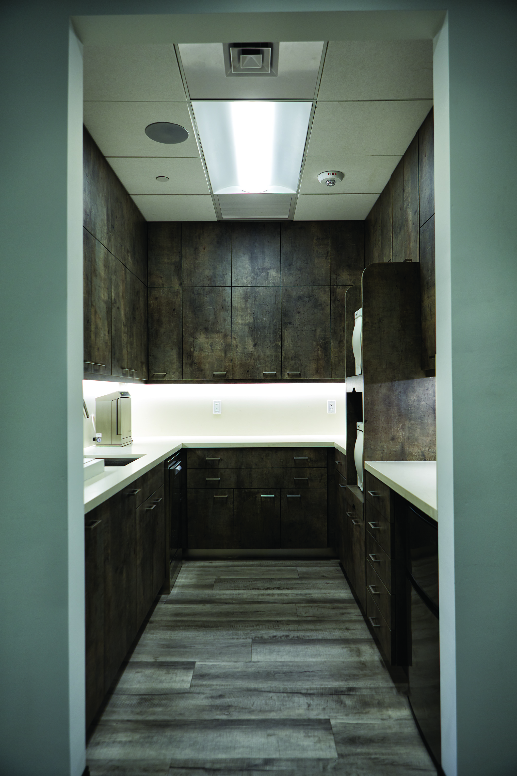 Patients enter the spacious clinical area and turn left to reach the treatment rooms, and right to access the imaging alcove, which is open to the hallway, providing patients with a visual reminder of the doctor’s deep commitment and investment in cutting-edge technology. Doorways along the hallway open to two consultation rooms, a large conference room, a laboratory and sterilization suite, and private offices. There are six treatment rooms, of which two are large surgical suites.