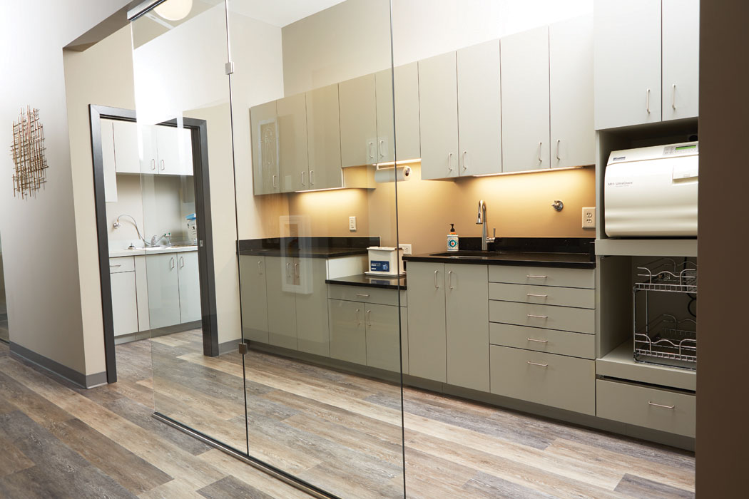 The weathered-looking faux wood flooring adds warmth to a sleek, state-of-the-art sterilization center with a M11 sterilizer, which sits behind a full wall of glass in the hallway. A doorway connects it to the onsite lab.
