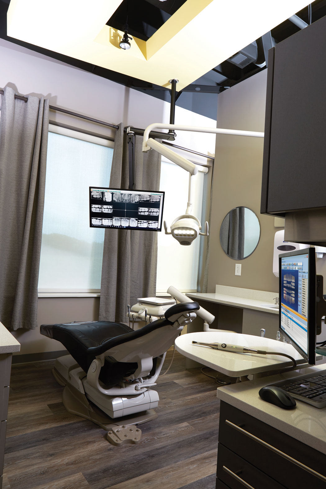 Dr. Terry Lemons opened his second office, Lemons Dental, in February 2017, so he has a good working knowledge of how to balance all of those issues and decisions. His new 2,200 square-foot office is a testament to working with a team to get the maximum impact out of every dollar spent, whether it’s on equipment or design pieces. The office is sleek and has a hip feel to it with luxe lighting elements and long sightlines with exposed ceilings that give it an industrial, upscale look.