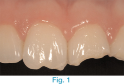 A 22-year-old female with traumatic injury to the maxillary central incisors and left lateral was presented. The original tooth fragments were not available. After the gross initial examination the teeth in question were examined in detail, the teeth were found to be vital with no pulpal exposure. There was absolutely no discernable mobility and the patient was not experiencing any distress or pain. In all other aspects the teeth did not show any other pathology. After detailed clinical observation and further evaluation of the photographs, it was noticed that there were areas of minimal tooth structure, which had been crushed at places along the fracture line and the break was not a clear cut. (Fig. 1)