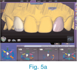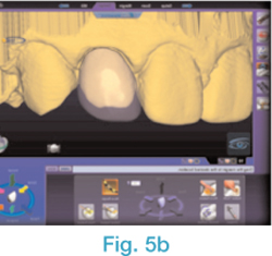 The diagnostic findings directed us to conclude that no-prep veneers would be the ideal treatment choice. Recontouring of the gingival architecture was performed using a diode laser (Odyssey Navigator, Ivoclar Vivadent). An intraoral digital impression was taken using the E4D Dentist System. Because no powder was used, there was no hesitancy scanning the intraoral condition immediately following the laser surgical procedure and wound. The digital model was used to design the restorations that would later be milled from ceramic blocks. (Fig. 5a, 5b)