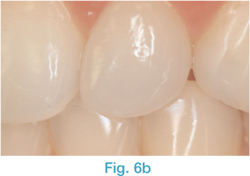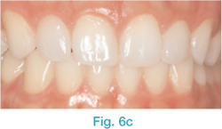 Because of the precision of the mill, the restorations could be designed ideally to a minimal thickness in areas of less than 200 microns. The restorations were bonded without the need of anesthetic, since no tooth structure was removed. (Fig. 6a, 6b & 6c)