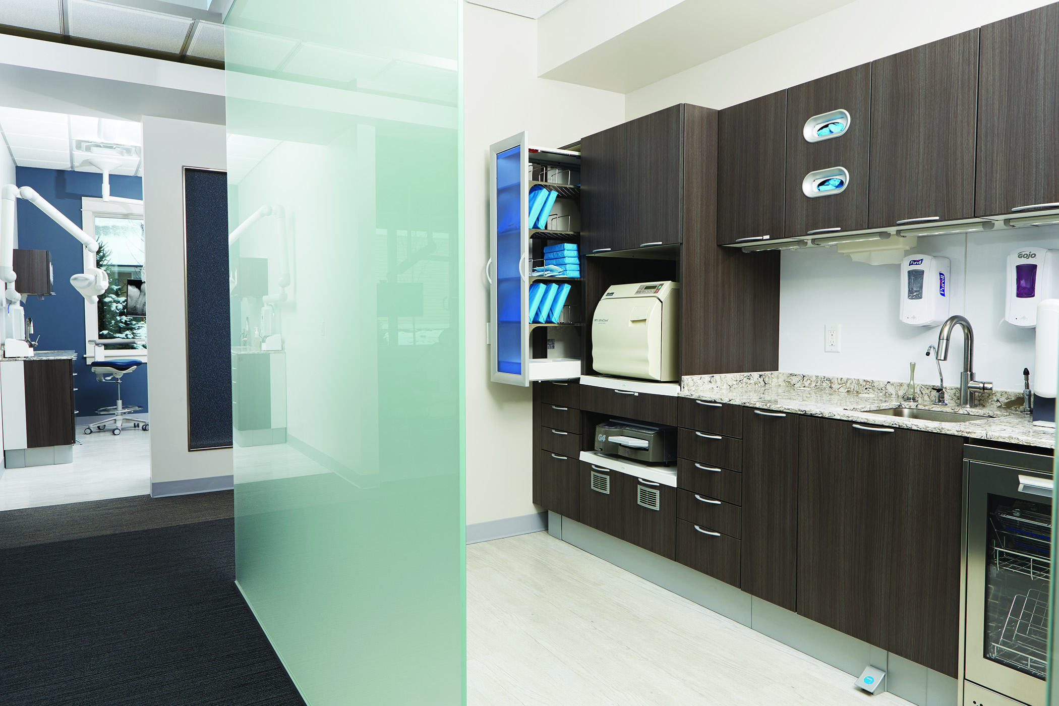 Set behind a glass wall, the A-dec sterilization suite was purposely set out in the open for patients to observe the instrument sanitizing process.