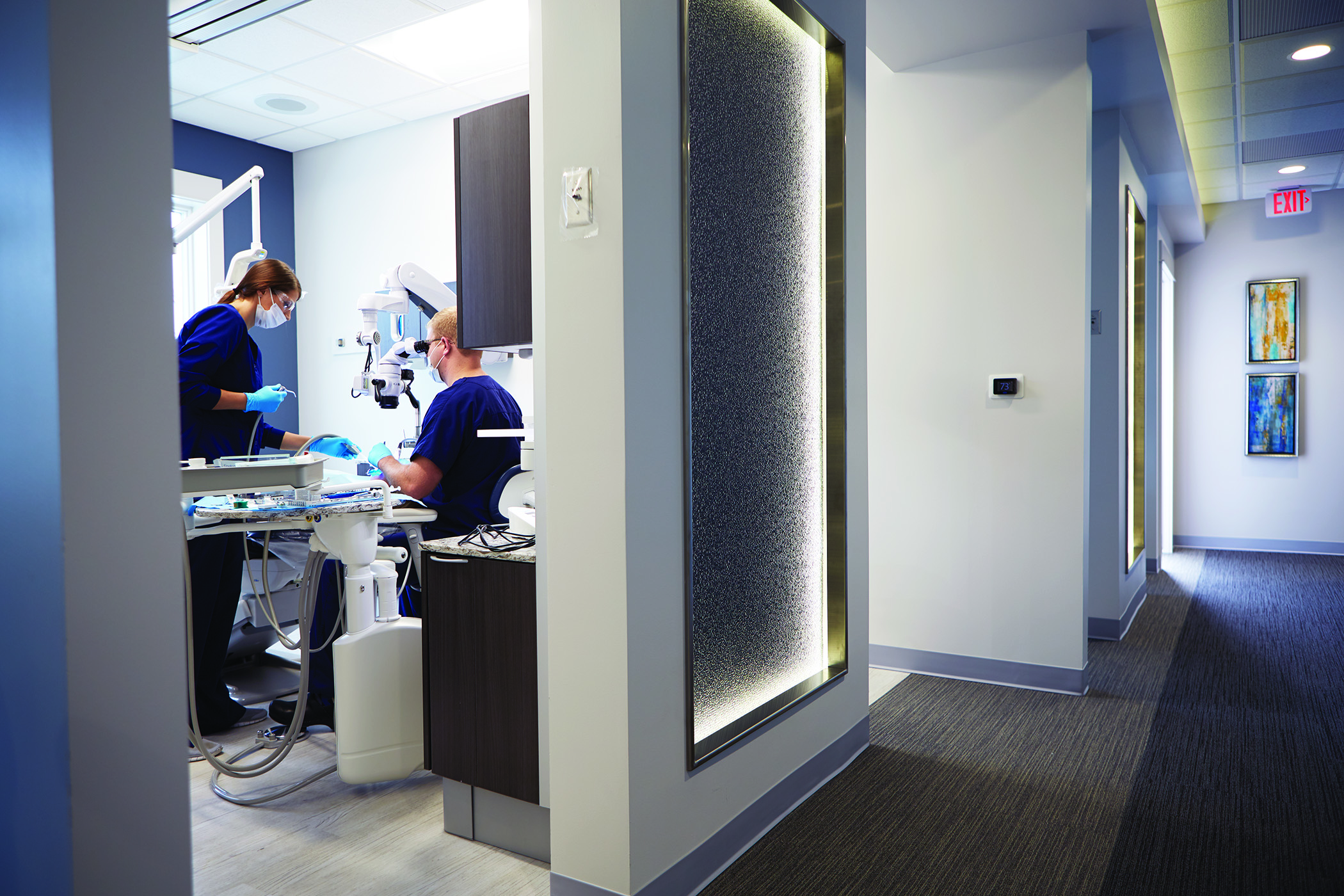 Another favorite feature for the doctor is the inlays that are built into the ends of each operatory. Not easy to perfect, they are trimmed in stainless steel with back lighting and a blue, textured wall covering.