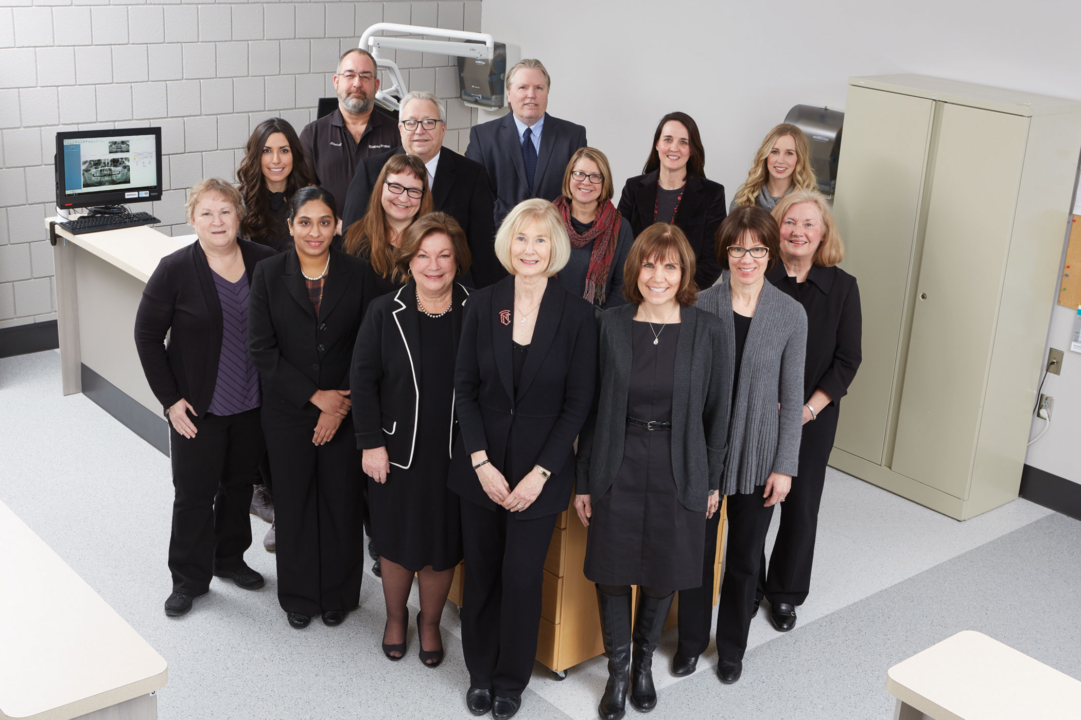 Front Row: Elizabeth Blazer, Clinic Manager; Archana Venkataraman, DDS, Staff; Carol Larsen, RDH, Department Chair; Colleen Brickle, EdD, RDH, Dean of Health Sciences; Deb Sidd, RDH Med, Faculty; Heidi Ahlgrim, RDH, Med, Faculty; Gale Chovanec, RDH, Med, Faculty. Second Row: Rachel Kashani-Legler, RDH, MS, Faculty; Laura Kinney, DDS, Staff; Holly Knutson, BSDH, MS, Faculty; Stephanie Zarse, BSDH, MS, Faculty; Megan Smith, BSDH, MS, Faculty. Third Row: Stuart Smith, Equipment Service Technician, Michael Minor, Regional Equipment Manager, Special Markets; Nick Hinrichs, Regional Operations Manager.