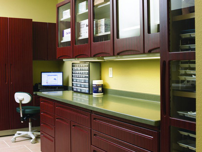 Contemporary furniture, fabrics, and fixtures were used in the reception area and throughout the facility, with treatment areas painted in cool and calming colors. The office’s abundance of large windows helps to create a feel of openness. Midmark cabinetry was used to maximize utility space and provide better work flow. “We spent a great deal of time at the Texas Dental Convention,” comments Bill Hildebrand. “The Midmark line represented a durable, efficient, and beautiful look and feel that the Doctor and his staff wanted. It was a unanimous decision.”
