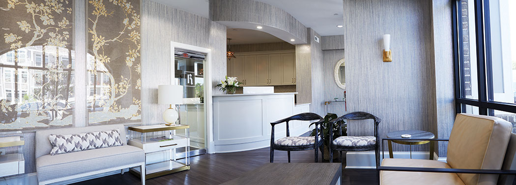 When patients enter the reception area, it’s entrancing, with walls covered in metallic, grass-cloth wallpaper and large floral prints displayed above a plush sofa. Contemporary tables in glass and metal, modern light fixtures including spiked chandeliers, and abundant gold accents throughout contrast with dark wood floors that warm up the modern aesthetic. Thick white molding adds a clean, residential feel to the office. Even the children’s area is chic, with wallpaper dotted with abstract birds alongside eye-catching minimalistic art.
