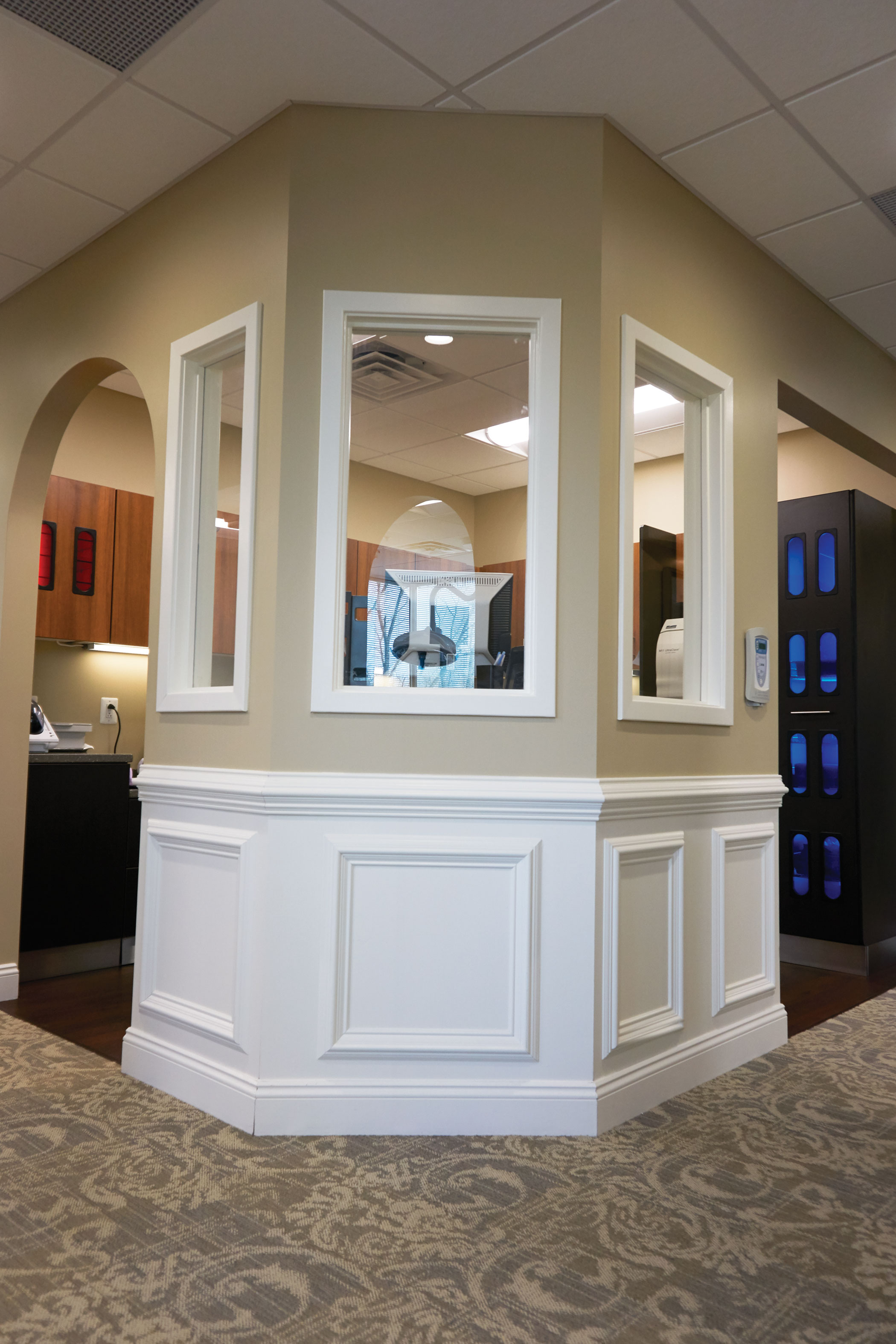 Even the grand professional building that sits back from the road in a sanctuary of beauty is freshly renovated, upscale, and modern. Its smooth façade is filled with windows. Inside the practice, patients are greeted by plush patterned carpeting that leads them into the reception area, with a stacked tile wall, rich solid surface counters, and paint in warm tan, white wainscoting, and oversized traditional moldings.