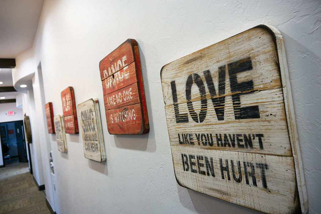 The lively carpeting pulls out the deep violet paint on the wall behind the desk, which features a unique logo wall, fashioned from an eight-foot slice of natural wood. Most of the remaining accents are white, which provides a serene backdrop to the colorful works on display from local artists, which rotate quarterly.
