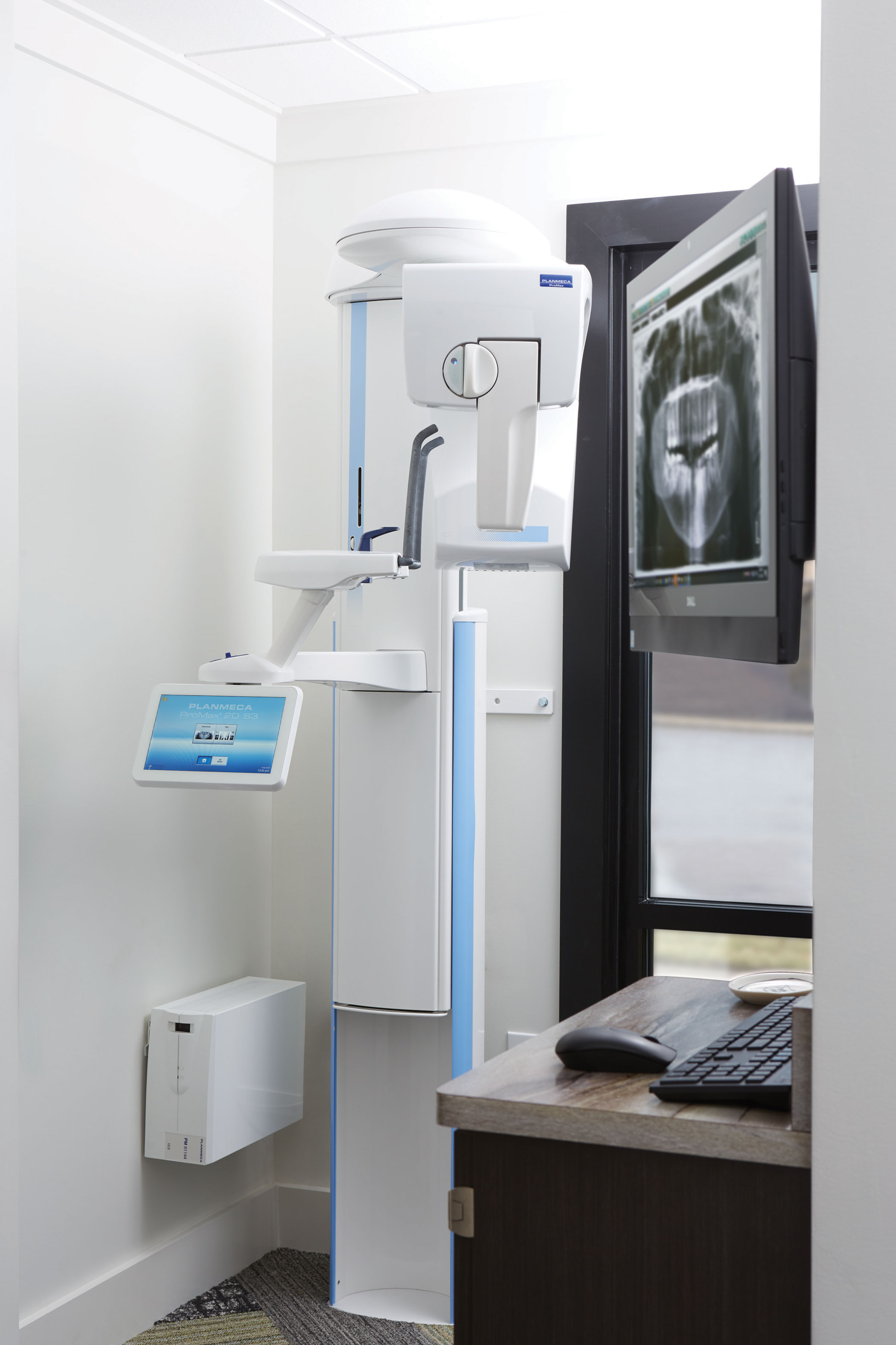 Further down the hall, the Synthesis sterilization center has a walk-through design with separate entry and exits. It’s located close to the cluster of treatment rooms, and its dark gray solid surface counters atop the white cabinetry have plenty of room for dirty-to-clean processing. Plus, the doctor’s Planmeca panoramic X-ray unit is out of the sterilization room for good and is now tucked into a separate imaging alcove near the front of the clinical area! The doctor selected the Planmeca ProMax because of good reviews from colleagues and its ability to capture extraoral bitewings.