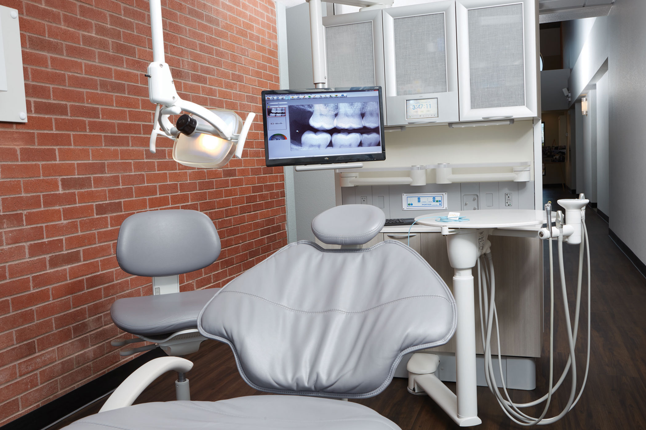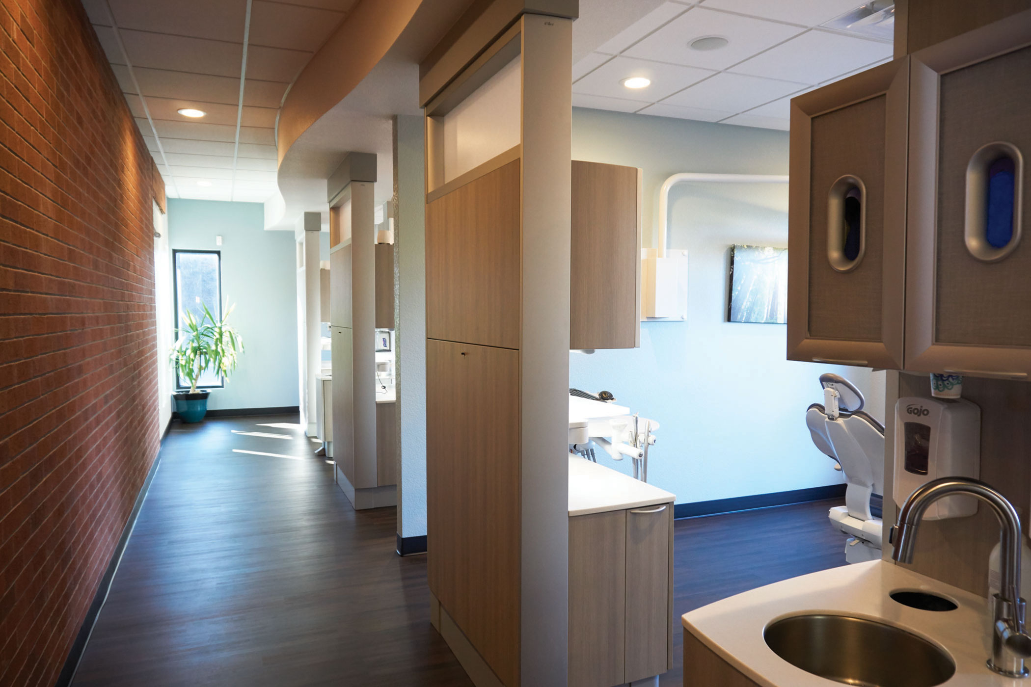 All of the rooms are plumbed with nitrous oxide, replacing the single cart they rolled from room to room in the previous office, and cavitrons are integrated into the delivery units.