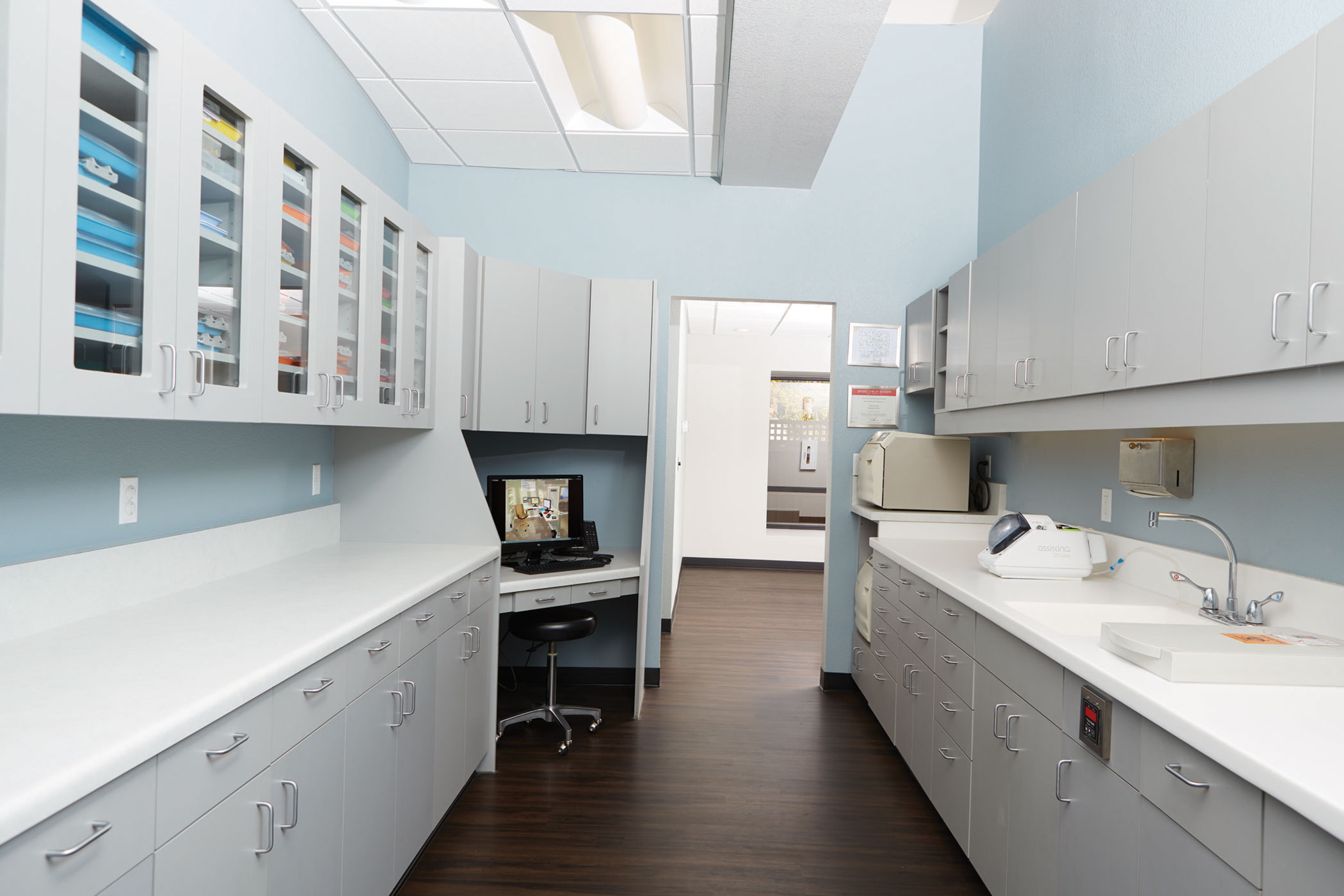 With three doctors working simultaneously to service a growing patient load, support areas like the lab and sterilization room had to be generously sized to facilitate a smooth workflow. The sterilization room is walk-through, with dirty items on one counter and clean on the opposite. Because each doctor uses different materials and tray set-ups, they invested in two sterilizers and one ultrasonic unit to move items through the process quickly.