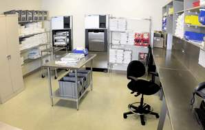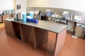 The clinic’s modern and highly functional open-bay operatories were configured as “pods” with ample space for four-handed dentistry and greater mobility during periods of increased activity. Customized, rear-delivery cabinets, Pelton & Crane 3000 chairs, and KaVo high-speed handpieces are a few of the high-end equipment selected for maximum efficiency and best ergonomics in the treatment areas. The sterilization area is situated to adequately service the clinic’s many operatories by means of a color-coded conveyor system that indicates which instruments have successfully passed through the process.