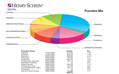 It’s often a surprise to see a year’s worth of you and your team’s efforts summed up in one chart, and the information here is amazing. Using coding, you’ll see what percentages certain aspects of your offerings are representing in regard to production. See the Procedure Mix example above.