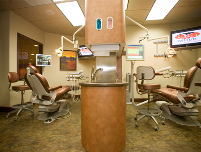 The Nash Institute's floor plan is ideal for its many activities. Sleek, contemporary furnishings and cabinetry offer a perfect merger of style and ergonomic sensibility. Wood floors; soft, earthy paint and carpet tones; and original artwork by local talents make the decor inviting to all who visit the office. "Patients are aware they are in a teaching facility, but still feel comfortable," remarks Dr. Nash. "We have 35 doctor stations for hands-on training and a teaching room that can be used for 60 students or converted to space for 30 more hands-on trainees. Our main focus is on Esthetics dentistry and team training."
