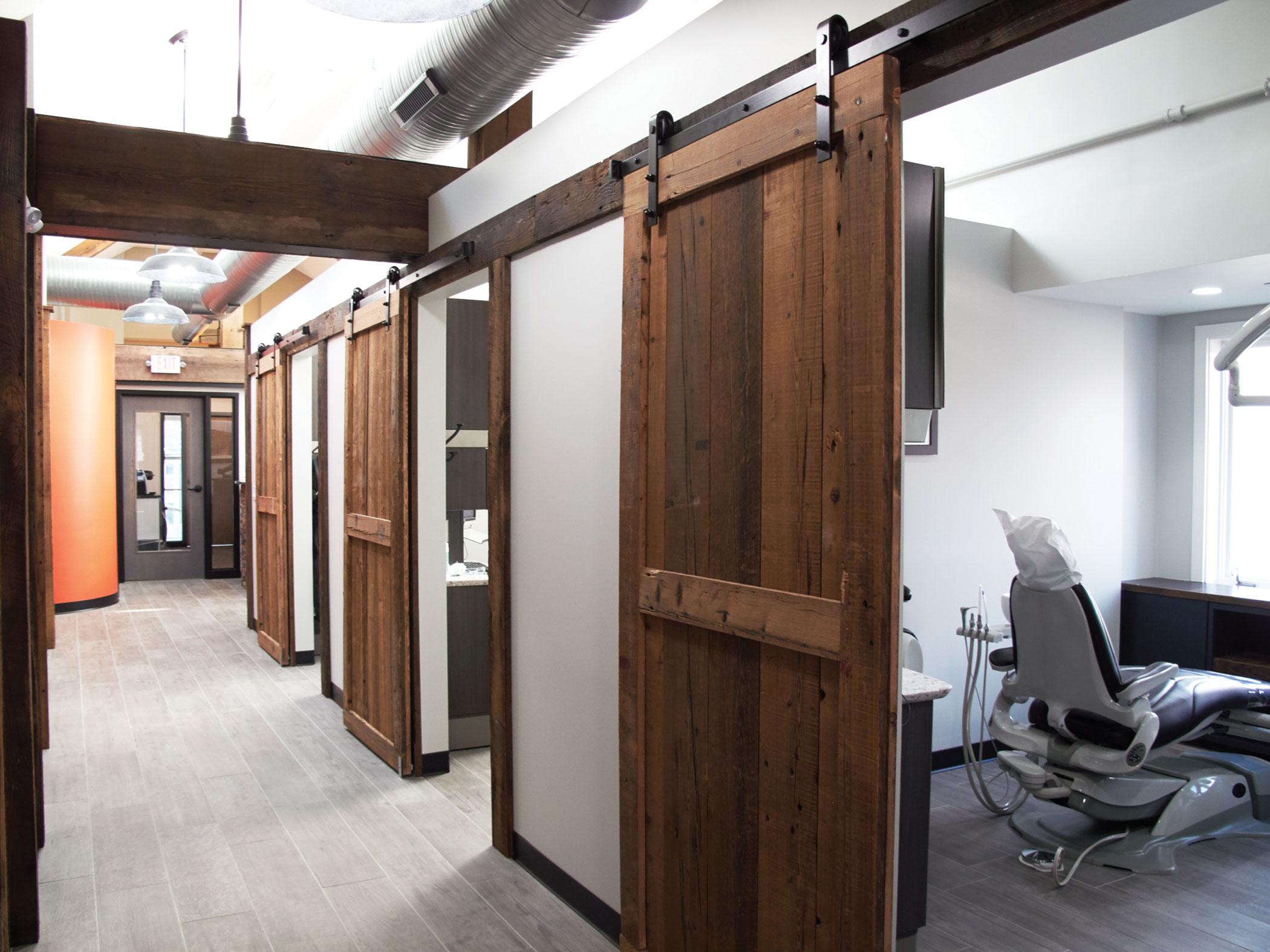 “We paid attention to every detail, and we tried to use reclaimed materials like chestnut barn wood that’s more than 100 years old. We know exactly what barn it came from!” the doctor shared. They also used faux-wood porcelain tile imported from Italy, marble sliced tiles for the bathroom floor, and marked off each of the operatories that run along the outside of the practice with sliding barn doors.