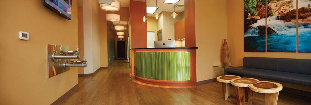 The 2,650 square-foot general dentistry practice is bright and cheerful, designed with a lush rainforest theme. A lively color palette of oranges and greens is fresh and invigorating, with custom lighting that’s unique and adds texture and movement to the reception area. This crisp and contemporary office, with its glass walls, kids’ area complete with iPads, quartz countertops, and faux wood flooring, has a sophistication that is carried into seven treatment rooms—five that are currently equipped, with two reserved for future growth.