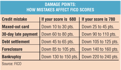 The “damage points” data, unveiled recently by Fair Isaac Corporation (FICO), a leading consumer credit-scoring system, are part of the most revealing glimpse into the firm's oncesecret – and still mysterious–credit scoring model. The new information discloses how many points borrowers' scores will drop when they make the most-common mistakes.