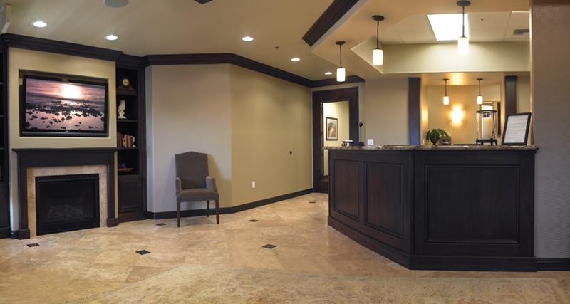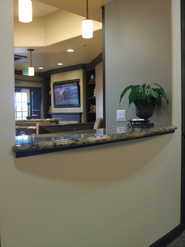 El Dorado O&M Surgery gets high scores in the design department with an aura of relaxed simplicity. Its “good looks” create the perfect mood for staff and patients, and make busy workdays a pleasant experience. The motif in the office is modern traditional with contrasting dark woods, carpeting in hallways, finished wood planks in the consult rooms, and an eye-catching tray ceiling in the reception area. “People are amazed at how nice the office looks,” comments Dr. Straw. “Many remark that it feels like a really nice ‘house’ until they pass into the operatory space, which is what I aimed for when the facility was designed.”