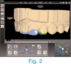 Hence, a decision was made to incorporate a small chamfer at the fracture line so that it could be masked more effectively with an indirect bonding procedure, which would also help in blending the ceramic restoration fragment seamlessly with the tooth. An intraoral digital impression (scan) was taken using the E4D® Dentist System. The digital model was used to design the restorations that would later be milled from ceramic blocks. (Fig. 2)