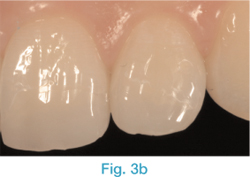 During the try-in procedure, it was obvious that the restoration would blend seamlessly with the remaining tooth structure. After glazing, the restorations were prepared with a hydrofluoric acid silanating agent (Monobond-S) and then were bonded using Variolink Veneer resin cement (Ivoclar Vivadent). (Fig. 3a, 3b)