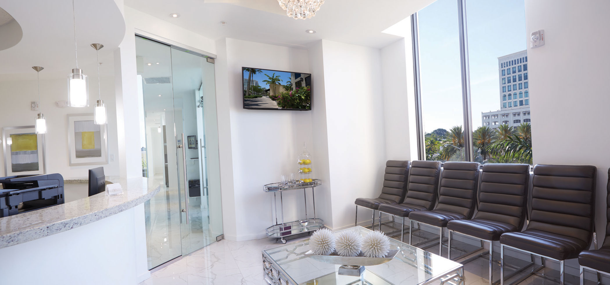 A shimmering crystal chandelier hangs from the ceiling, lending an air of refinement to the waiting room. With its clean monochromatic whitewash surrounding patients, the effect is calming and reserved. Relaxing music is piped throughout the space, and the office even smells good! The gorgeous design reinforces the reputation the doctor has for professionalism and state-of-the-art care.