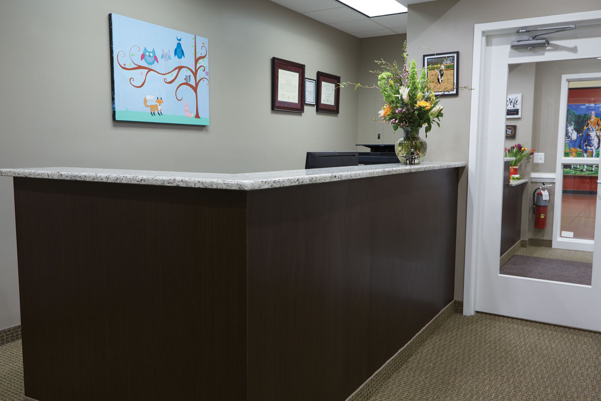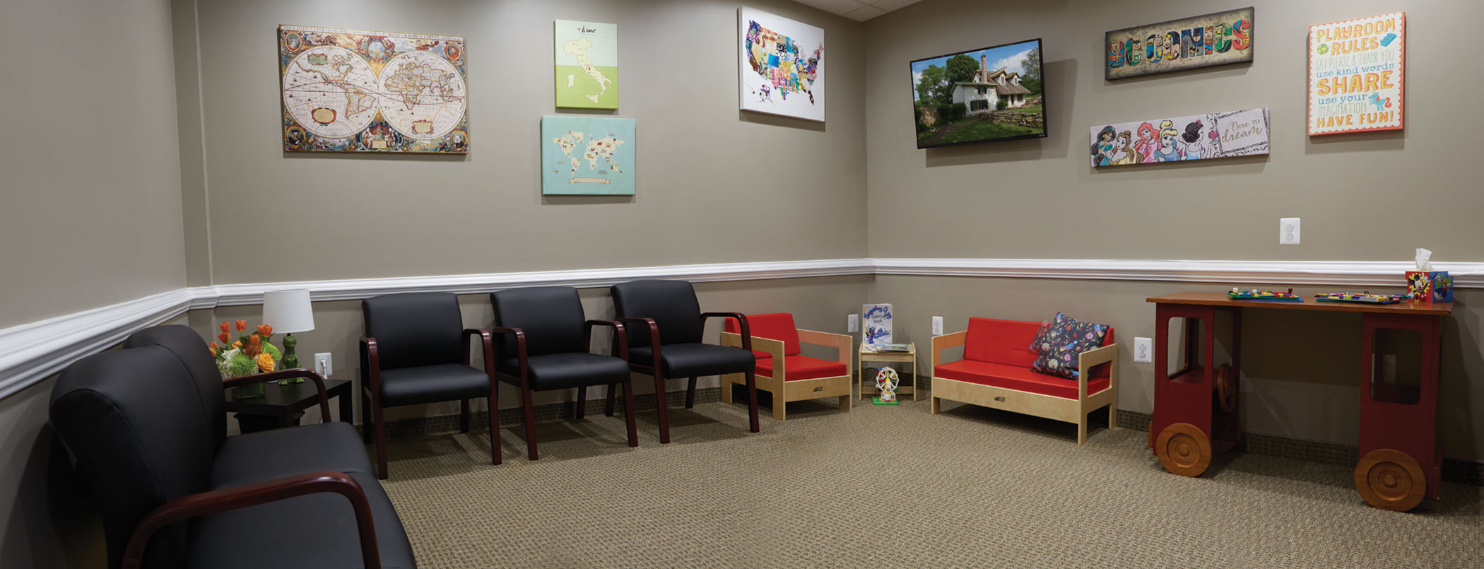 The entrance is simple with a glass window that has brightly colored characters peering out at the little patients coming inside. A long check-in desk, brightly colored seating, and a cheerful wall painting put kids at ease that this is a friendly place.