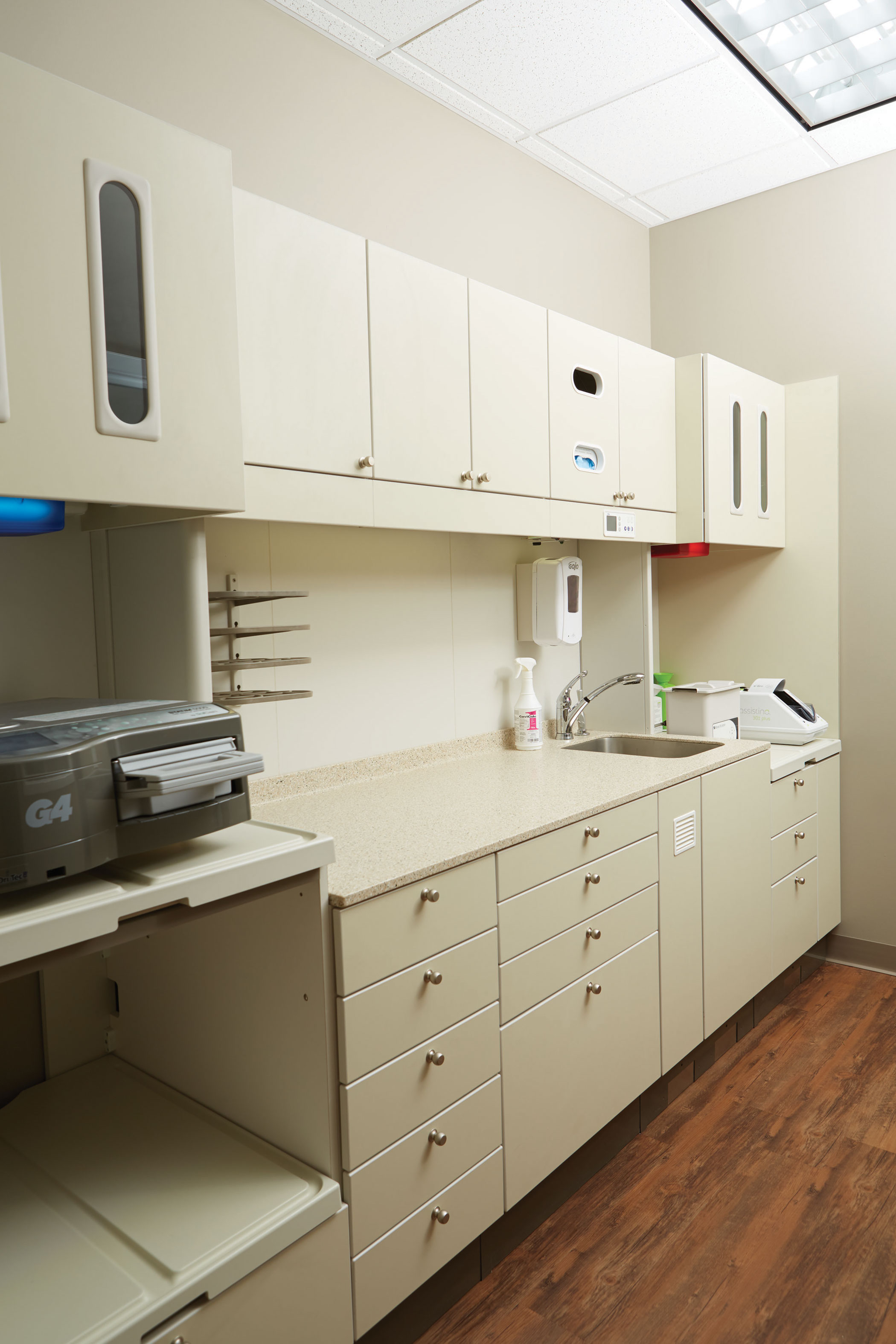 Across the hall from the imaging room is the sterilization area, which is tucked behind frosted glass. The sterilization area features the A-dec Preference ICC sterilization center, provides a galley-style configuration, and is equipped with a SciCan STATIM G4.