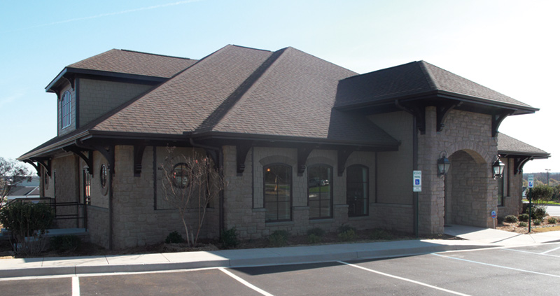 A unique and eye-catching Craftsman-style building is the new home of Dr. Harris’s practice. Natural stone, roofline wooden brackets, and porthole and Palladian windows are just some of the charming architectural details that define the exterior. Interior design elements include modern, dark wood furniture, marble countertops, and carpeted floors in the reception area and hallways, producing the relaxed feel of a living room. There is a coffee bar and wall-mounted TV monitors with easy viewing for patients who are awaiting treatment.