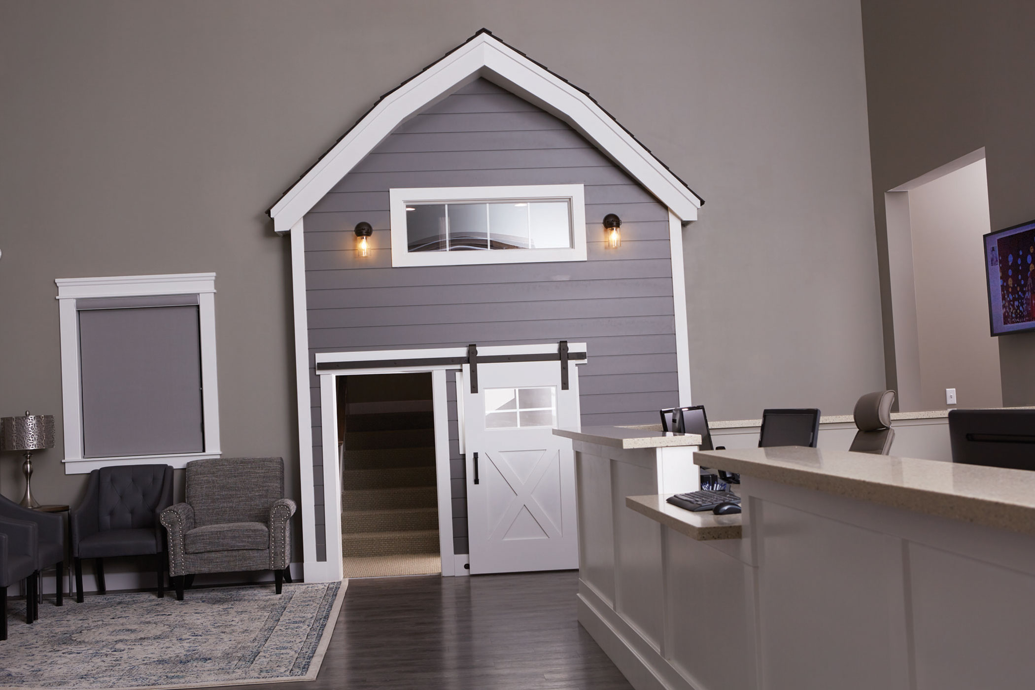 The practice’s old-world charm is immediately apparent from the exterior of the building, with its low roof, stacked stone accents and pillars, and porch areas. This classic style belies the sophisticated, cutting-edge ambiance and technology that waits inside its doors. When patients enter the large reception area, they are greeted with architectural details from the Craftsman period; earth-tone colors of beige, gray, and white in the floors, barn and batten wainscoting on the walls, and oversized wood trim around the windows. The overall design is a luxurious yet rustic farmhouse feel.