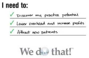 “Doctor, you are not busy enough—buy CAD/CAM or intraoral equipment. Doctor, you are too busy— buy a new operatory or build a new building. You want to do more cosmetic dentistry? I have just the new composite and bonding material for you,” etc… etc… . I am not suggesting that in some cases these are not proper solutions–in fact, many times they are. The issue is that it still requires the doctor to purchase something to solve the need. In other words, our competition’s philosophy is, Dr. buys something and you could grow. At Henry Schein, our philosophy is, “Doctor, let us help you grow, then buy.” In 27 years of working with dentists at many levels in our industry, I have never met or spoken to a dentist who went to sleep at night or drove to the office in the morning worrying about where to purchase dental supplies or equipment!