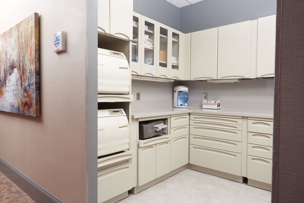 The sterilization room was left in its original configuration. It had been redone more recently anyway, so the doctor simply replaced her existing equipment with a new, high-grade Midmark M11 autoclave, a Midmark M550 ultrasonic cleaner, and a SciCan STATIM 5000 cassette sterilizer.