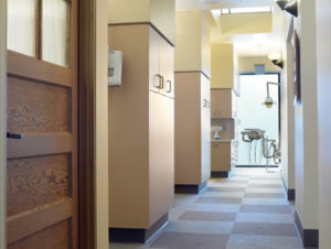 “One of the most exciting aspects of our project was our commitment to work salvaged products into the design of our space. Our finds included 13 vintage fir doors and 8 windows—which we stripped and refinished ourselves. A number of items came from a school built in 1910 in the Seattle area. The school was torn down because it did not meet seismic requirements,” comments the Doctor. The items recovered from the schoolhouse include a slate chalkboard that can be found in the reception area; an antique science cupboard now used in the Doctor’s office; several desks; and all clocks in the operatories.