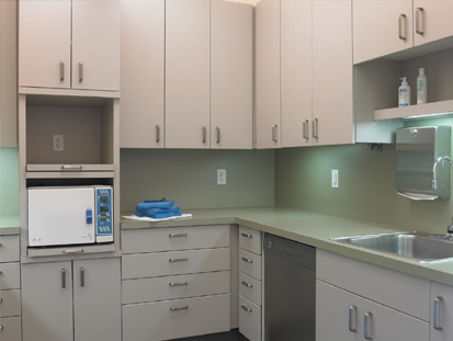 The Doctor’s long-standing relationship with Sales Consultant Scott Cook and Equipment Specialist Jim Hammon provided the expertise and support needed to carry the project forward. “Jim...helped us solidify our choice with preliminary drawings. [His] training as an architect was also key in the project’s success...[and his] experience with previous dental office design projects and...understanding of equipment layout was also paramount to the functionality of our new space. He researched environmentally friendly equipment and materials and pricing scenarios...and was also instrumental in the design of our custom dental cabinetry,” remarks the Doctor.